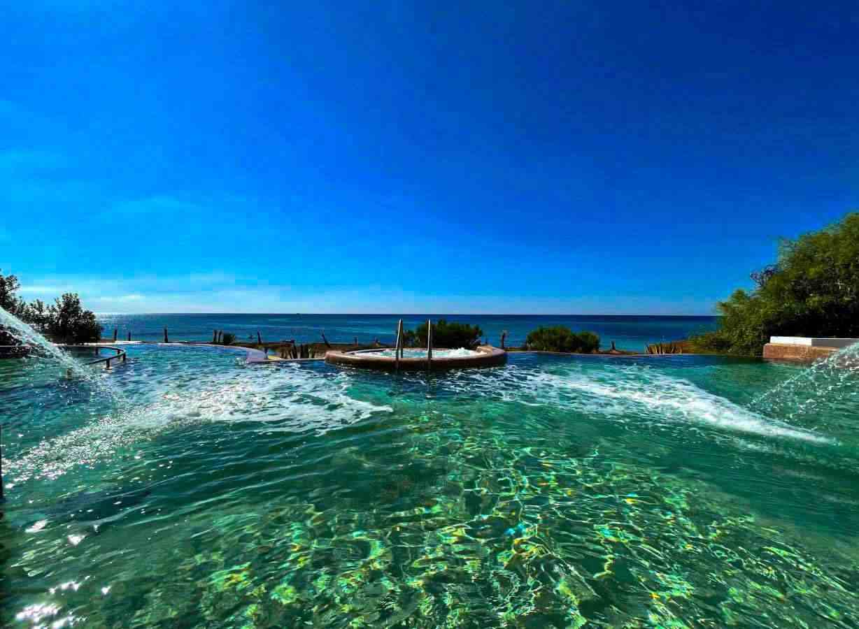 Une piscine aquamarine d'eau de mer chauffée à 33°C unique en son genre par